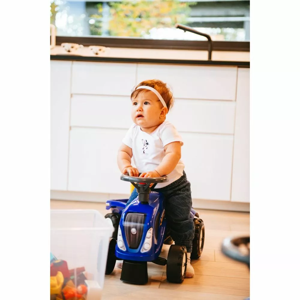 New Holland traktor 100% fremstillet i Frankrig til småbørn fra 1 år. Den er sjov med sine formede kurver, som vil gøre små gartnere glade. Dens lyse farver er perfekte til at vække opmærksomheden hos dit barn, og som også kan udvikle dets motoriske færdigheder og balance, mens barnet har det sjovt. Kan bruges både i haven eller indenfor takket være det drejbare rat med horn. Den søde lille traktor er udstyret med trailer med skovl og rive. Den kan nemt blive barnets foretrukne middel til at transportere deres yndlingstæppe fra soveværelset til stuen eller til små udendørs udflugter til f.eks. sandkassen. Et lille kit er inkluderet, hvilket giver dit lille barn mulighed for at vælge stil og en tilpasset nummerplade!