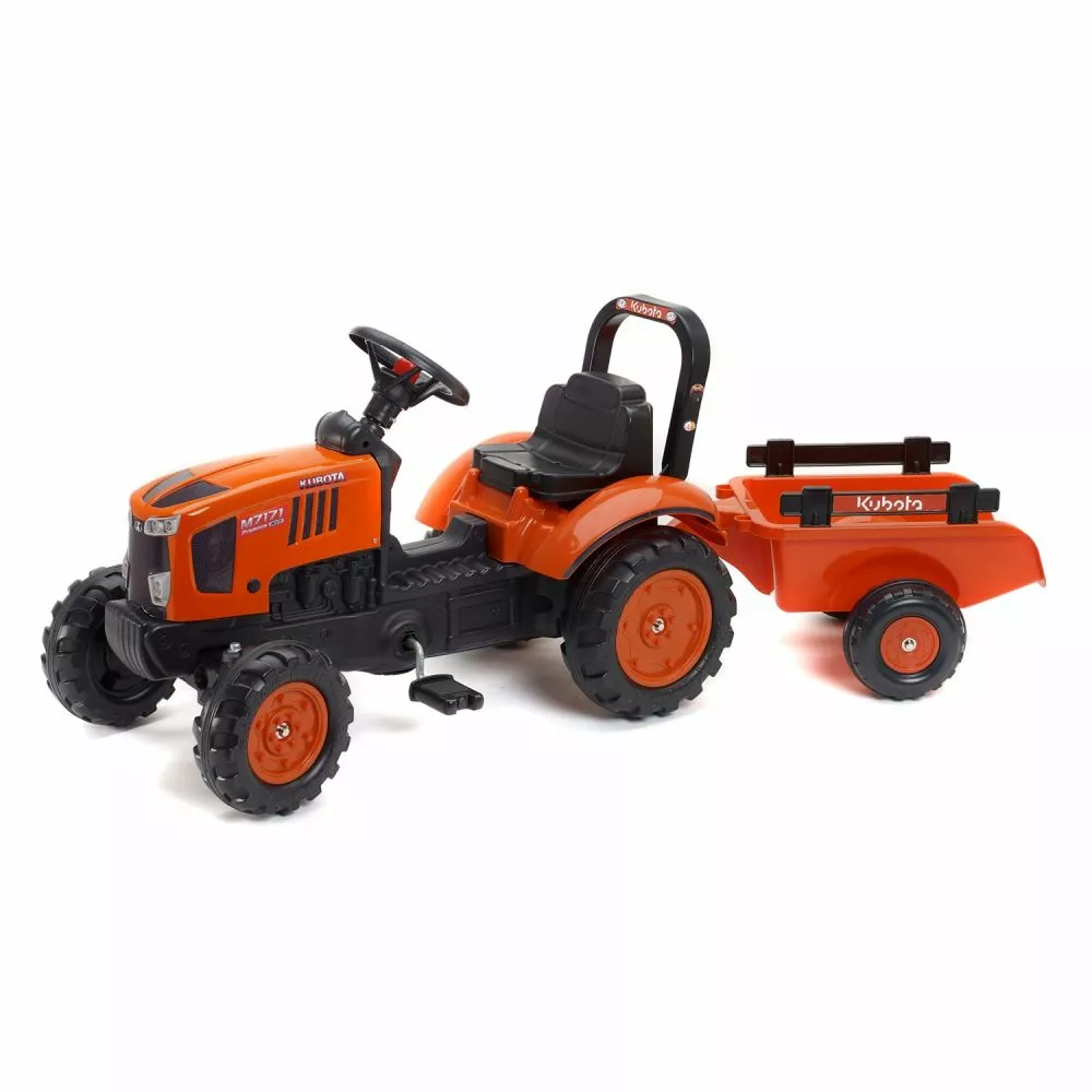 Denne Kubota-traktor med en sikkerhedsbøjle er specielt designet til små eventyrere fra 2 til 5 år. Det er en fin pedalreplika af M7171-modellen. Du kan nemt fastgøre traileren med sidepaneler, som gør det muligt at transportere sand, blade, jord og sten fra den ene ende af haven til den anden.
