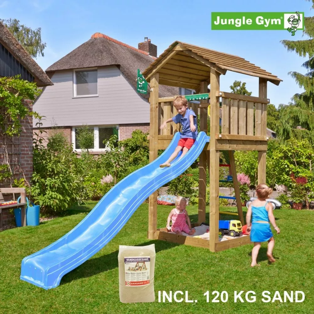 Jungle Gym Cottage legetårn komplet, inkl. 120 kg sand og blå rutschebane – 804-270SAB