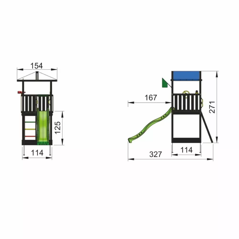 Legetårnet består af fyrretræ der er grundmalet i sort farve som passer godt til en hver have. Testet og overvåget for kvalitet og sikkerhed (i henhold til EN: 71-1, 2, 3, 8 & 9) CE godkendt.
