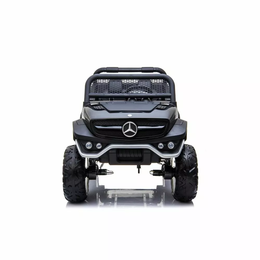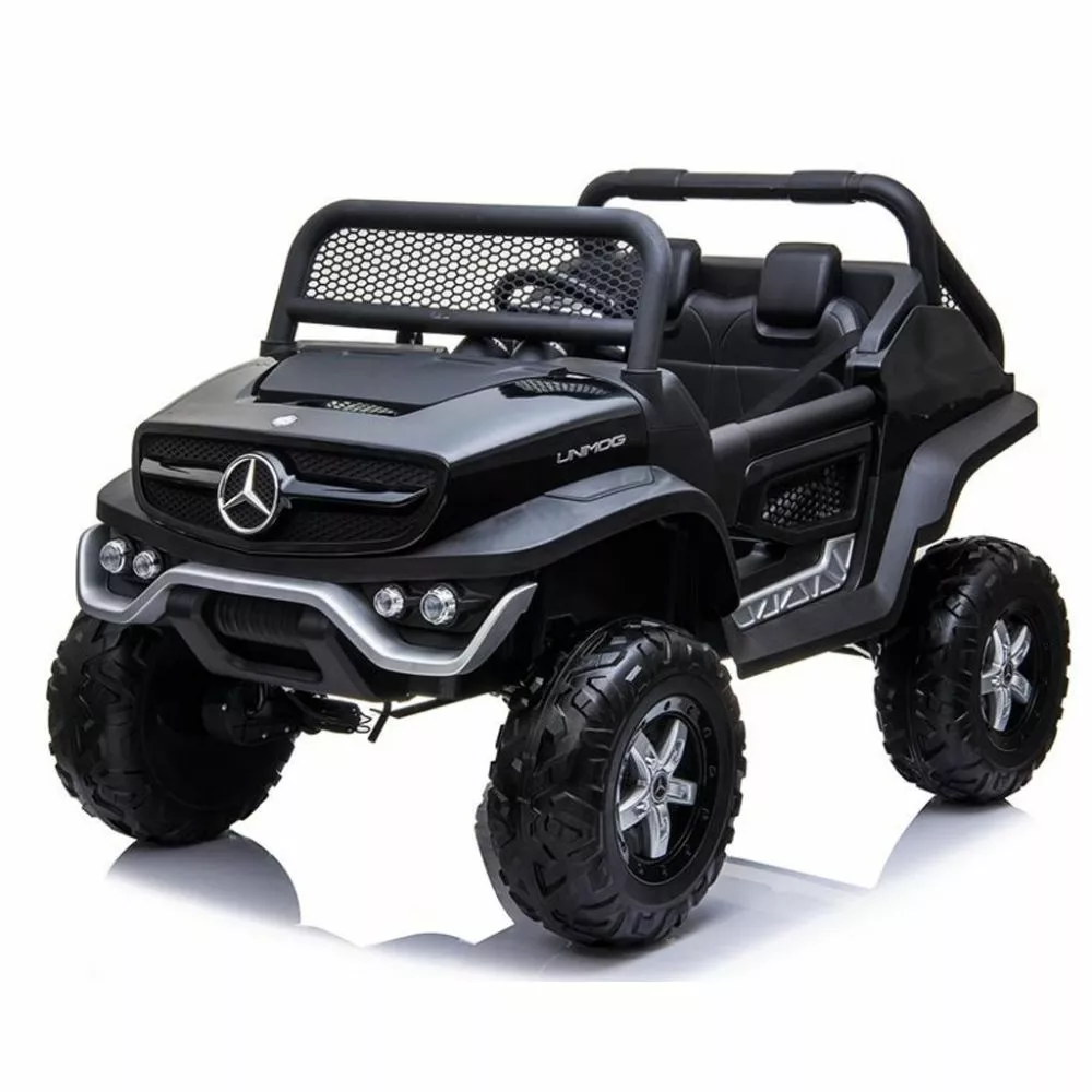 2 personers Mercedes Unimog med rigtige gummihjul og lædersæde monteret med 4 x 12V motorer og kraftig 12V/10A batteri, en rigtig stor sejtrækker der kommer igennem alt.