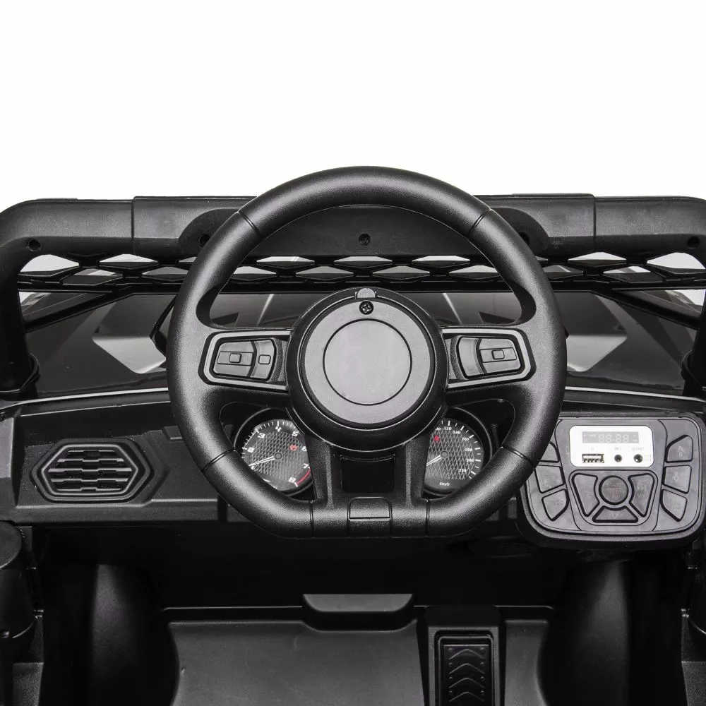 Understøtter MP3, bluetooth, FM radio funktion, lys, lyd, horn, gyngende funktion, realistisk instrumentbræt og design, døre kan åbnes, sidespejle og sikkerhedssele