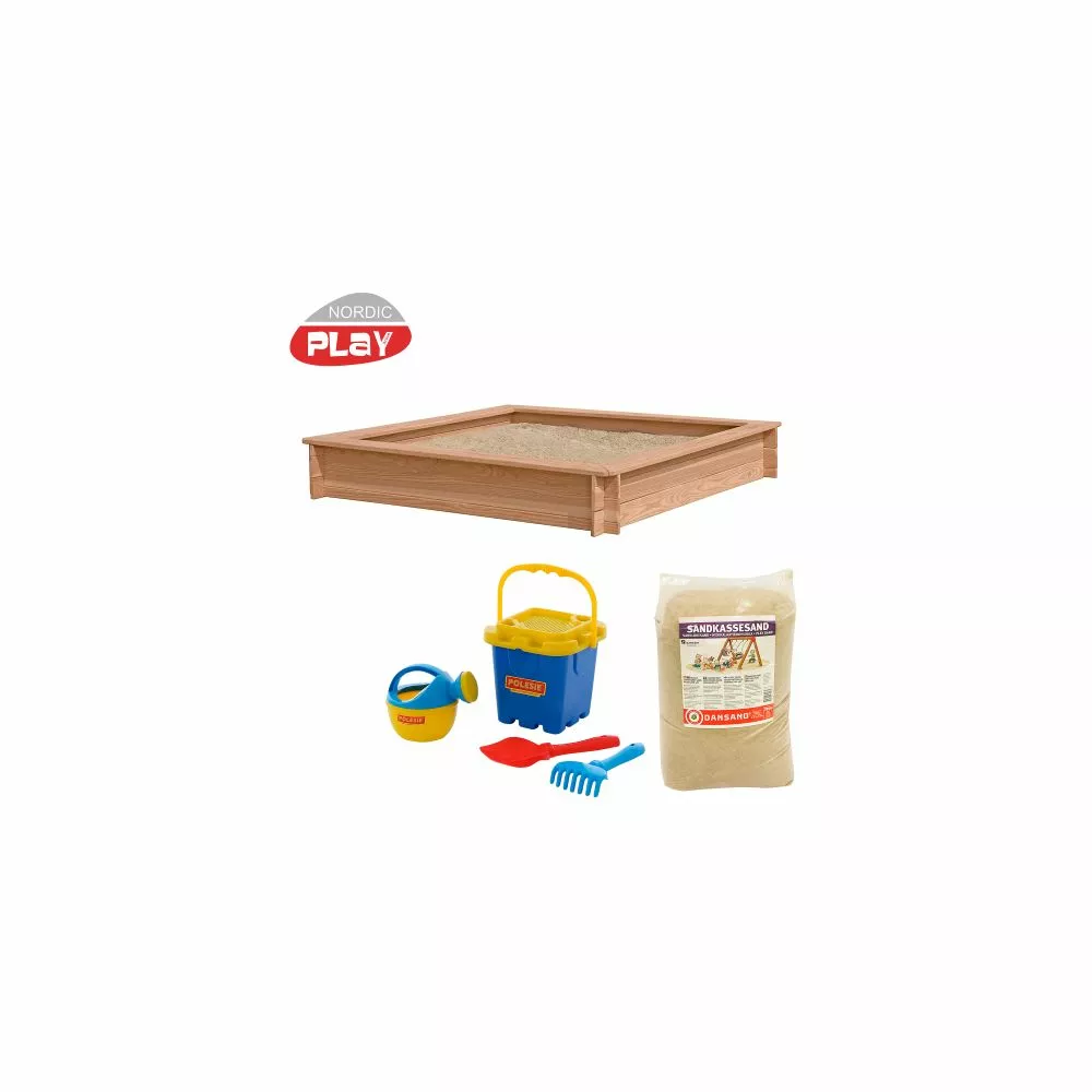 NORDIC PLAY sandkasse i lærketræ inkl. 240 kg sandkassesand og sandkasse legetøj med grøn spand/si med skovl, vandkande og rive