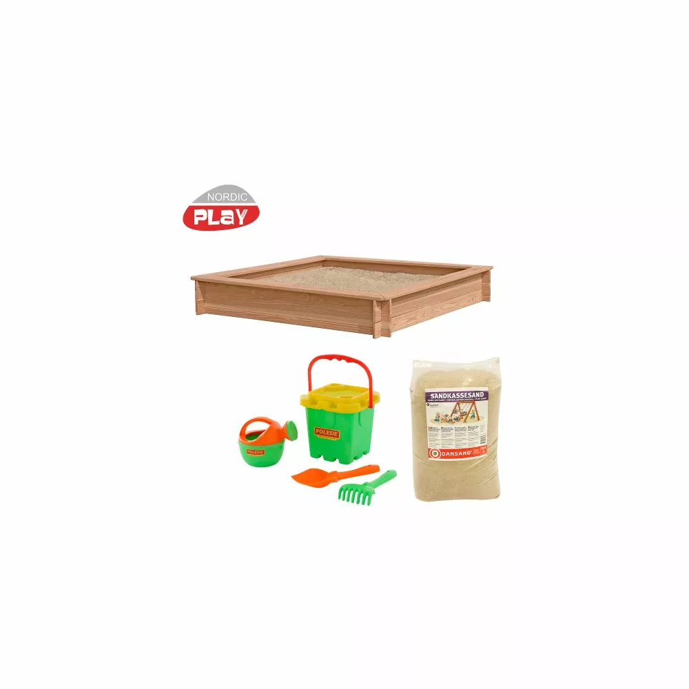 NORDIC PLAY sandkasse i lærketræ inkl. 240 kg sandkassesand og sandkasse legetøj med grøn spand/si med skovl, vandkande og rive