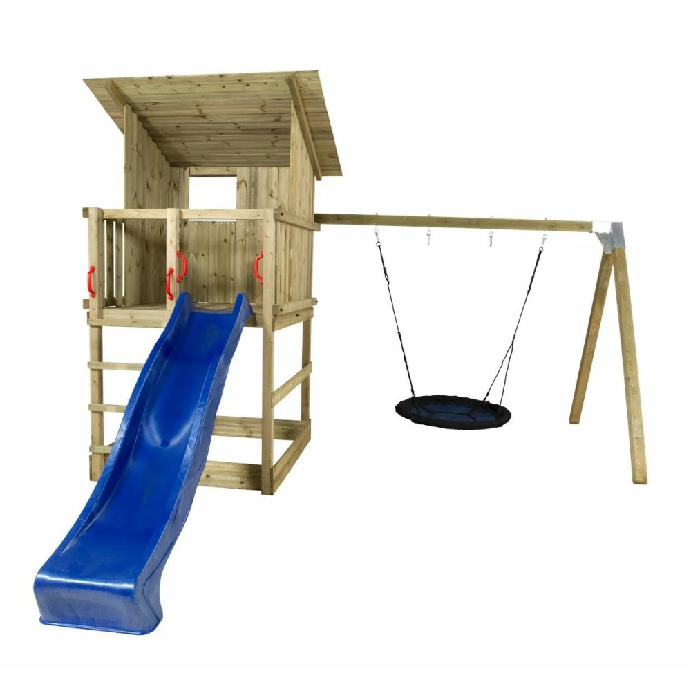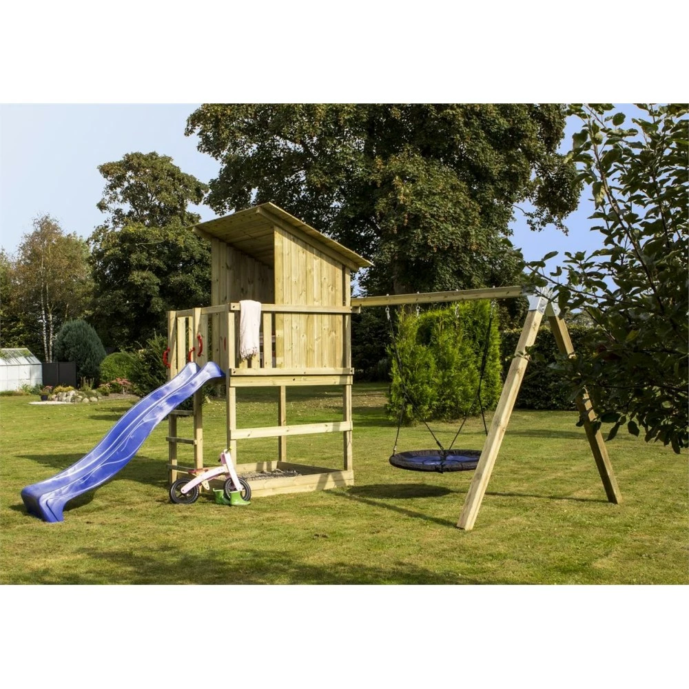 Plus A/S Plus Play Legetårn M/skråt Tag Trykimprægneret Inkl. Gyngestativ Blå Rutsjebane Og Redegynge 185280-3